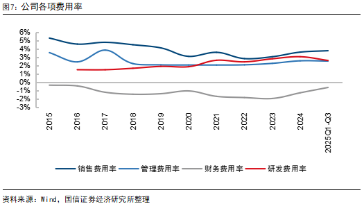 2025Q1-Q3销售/管理/研发/财务费用率分别为3.8%/2.5%/2.6%/-0.6%,销售/管理/研发/财务费用率同比分别为+0.24/-0.04/-0.04/+0.61pct;2025Q3销售/管理/研发/财务费用率分别为3.6%/2.6%/2.4%/-0.6%,销售/管理/研发/财务费用率同比分别为+0.7/+0.3/0.0/+0.3pct,环比分别为-0.5/+0.3/-0.1/0.0pct,2025Q1-Q3综合费用率8.3%,同比+0.8pct,2025Q3综合费用率8.1%,同比+1.3pct,环比-0.3pct,2025Q3费用率同比提升,预计由于新国标切换、高端品牌零际推出等导致费用投入增加。