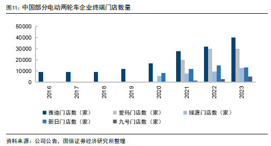 产品方面公司推出女性产品线、科技产品线、商用车产品线、三四轮产品线、精品及服务产品线,全面覆盖用户需求,女性产品线的元宇宙、爱玛Q5等外观亮眼;科技产品线的A7Plus主打高性能、长续航等特点,公司根据不同的应用场景推出多款差异化产品,匹配用户需求;10月28日公司推出高端品牌零际,正式宣布进入高端电摩赛道,有望实现向上拓展。渠道方面,2023年公司终端门店数量3万家,以旧换新促进行业需求,公司将积极提升门店数及单店店效,有望促进销量及市占率提升。