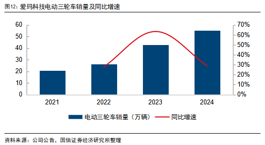爱玛产品涵盖休闲三轮、篷车三轮、货运三轮等多种品类,2024年电动三轮车销售55万辆,同比增长28.9%,销量快速提升,2025年公司推出高端三轮乐享CA500至臻版,电动三轮产品逐步完善,加强新品导入终端门店,电动三轮业务将打开成长空间。