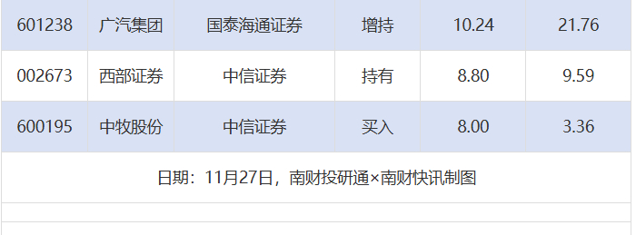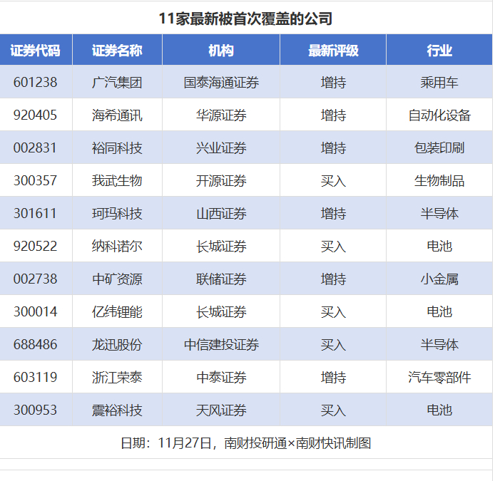 首次覆盖方面,11月27日券商共给出了11次首次覆盖,其中广汽集团获得国泰海通证券给予“增持”评级,海希通讯获得华源证券给予“增持”评级,裕同科技获得兴业证券给予“增持”评级,我武生物获得开源证券给予“买入”评级,珂玛科技获得山西证券给予“增持”评级。