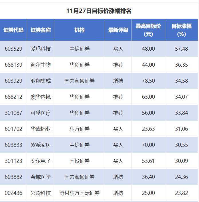 南财投研通数据显示,11月27日,券商给予上市公司目标价共13次,按最新收盘价计算,目标价涨幅排名居前的公司有爱玛科技、海尔生物、亚翔集成,目标价涨幅分别为57.48%、36.35%、34.58%,分别属于摩托车及其他、医疗器械、专业工程行业。