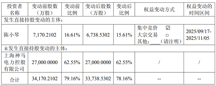公司于2025年11月5日收到股东陈小琴出具的《股份减持进展告知函》,2025年9月17日至2025年11月5日,陈小琴通过集中竞价交易方式合计减持公司股份4,316,800股,占公司总股本的1.00%。本次权益变动后,陈小琴及其一致行动人持有公司股份的合计比例从79.16%减少至78.16%,权益变动触及1%整数倍。