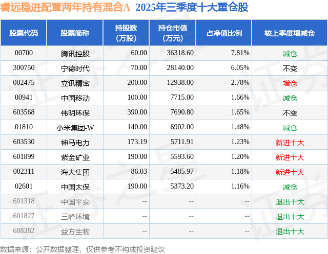 睿远稳进配置两年持有混合A的前十大重仓股如下: