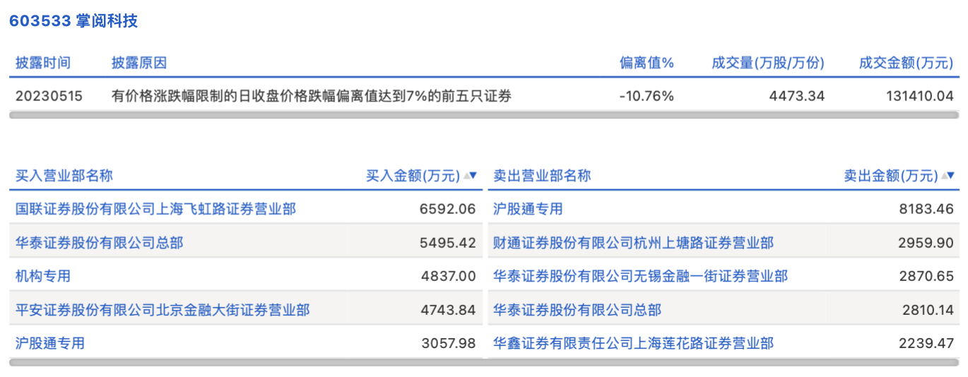 5月15日,掌阅科技今日跌9.59%,龙虎榜数据显示,上榜营业部席位全天成交4.38亿元,占当日总成交金额比例为33.32%。其中,买入金额为2.47亿元,卖出金额为1.91亿元,合计净买入5662.69万元。