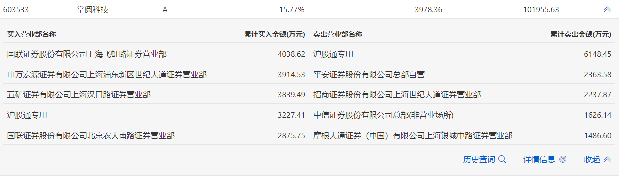 5月30日,掌阅科技今日涨停,龙虎榜数据显示,上榜营业部席位全天成交3.18亿元,占当日总成交金额比例为31.15%。其中,买入金额为1.79亿元,卖出金额为1.39亿元,合计净买入4033.17万元。