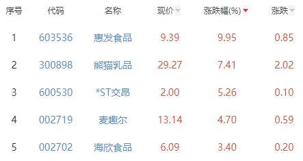其中,惠发食品、熊猫乳品、*ST交昂、麦趣尔、海欣食品位列板块涨幅前五位,涨幅分别为9.95%、7.41%、5.26%、4.70%、3.40%。