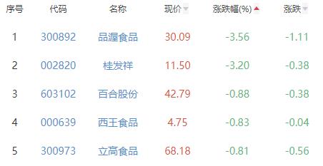 品渥食品、桂发祥、百合股份、西王食品、立高食品位列涨幅榜后五位,涨幅分别为-3.56%、-3.20%、-0.88%、-0.83%、-0.81%。