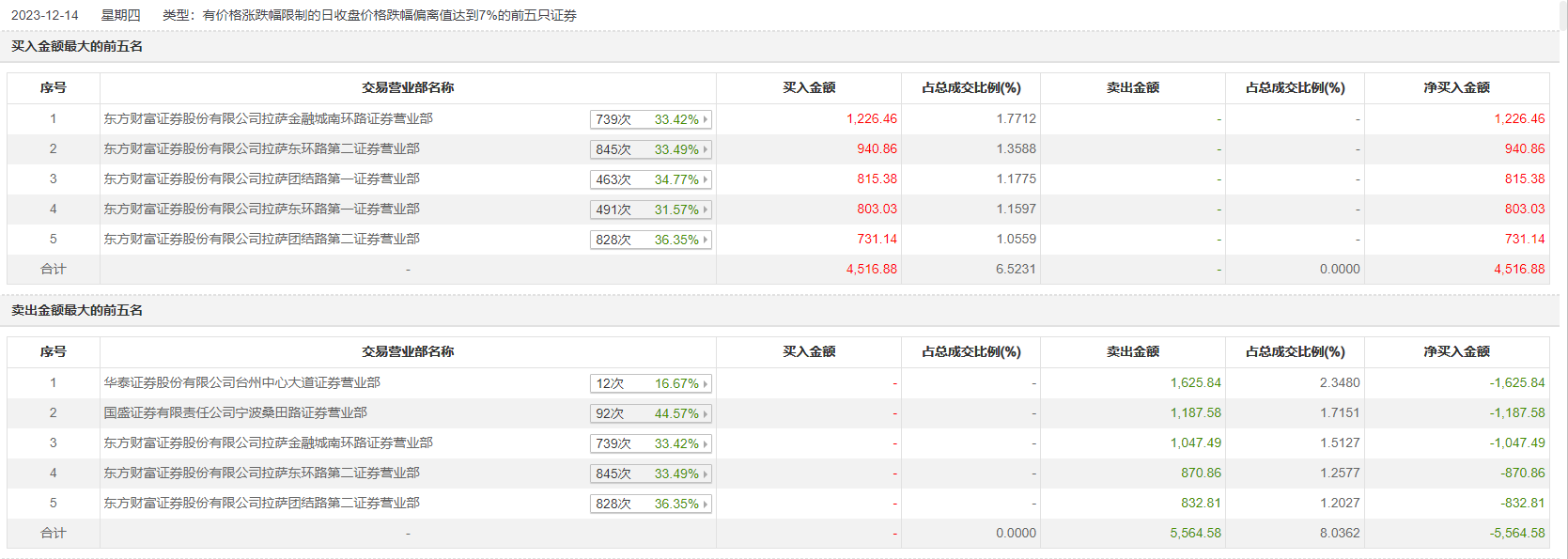 具体来看,知名游资现身龙虎榜,方新侠(华泰证券台州中心大道证券营业部)、宁波桑田路(国盛证券宁波桑田路证券营业部)分别卖出1625.84万元、1187.58万元;东方财富证券拉萨金融城南环路证券营业部、东方财富证券拉萨东环路第二证券营业部分别买入1226.46万元、940.86万元。