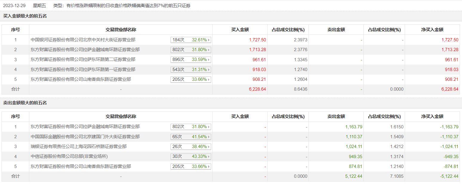 惠发食品12月29日跌9.71%,全天换手率达18.6%,振幅达5.64%。龙虎榜数据显示,营业部席位合计净买入1106.2万元。其中,东方财富证券拉萨金融城南环路证券营业部、中国国际金融北京建国门外大街证券营业部分别卖出1163.79万元、1110.37万元;中国银河证券北京中关村大街证券营业部、东方财富证券拉萨金融城南环路证券营业部分别买入1727.50万元、1713.28万元。
