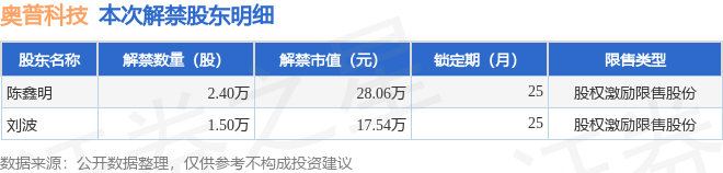 奥普科技(603551)3.9万股限售股将于11月26日解禁,占总股本0.01%