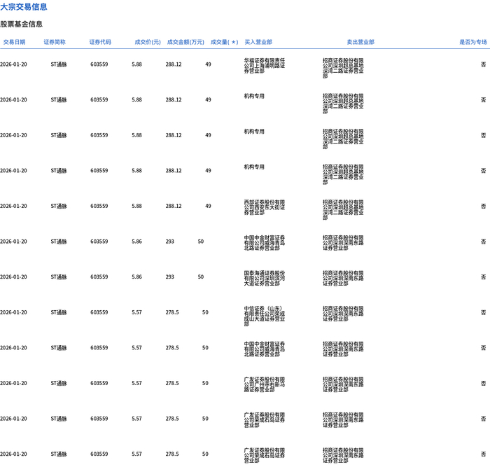 1月20日,ST通脉大宗交易成交595万股,成交额3419.1万元,占当日总成交额的20.65%,成交均价5.75元,较市场收盘价6.03元折价4.7%,其中最高成交价5.88元,最低成交价5.57元。