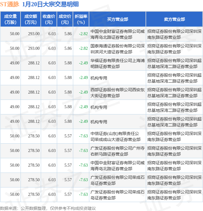 1月20日ST通脉现12笔大宗交易 机构净买入864.36万元