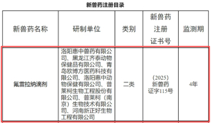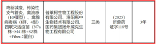 根据《兽药管理条例》和《兽药注册办法》规定,经农业农村部审查,批准“氟雷拉纳滴剂”与“鸡新城疫、传染性支气管炎、禽流感(H9亚型)、禽腺病毒病(I群,4型)四联灭活疫苗(N7a株+M41株+SZ株+Fiber-2蛋白)”为新兽药,并于2025年10月11日公示了核发《新兽药注册证书》(中华人民共和国农业农村部公告第957号)“(2025)新兽药证字115号”、《新兽药注册证书》(中华人民共和国农业农村部公告第957号)“(2025)新兽药证字118号”事项。
