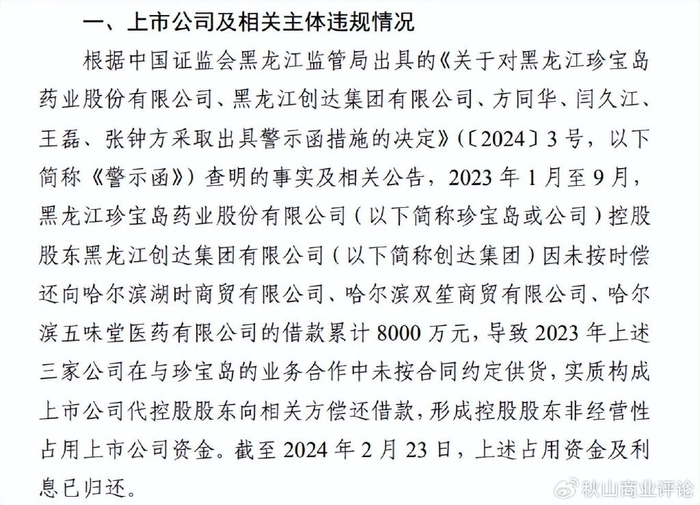 早在2024年4月28日,黑龙江证监局作出决定,对珍宝岛药业、创达集团、方同华、闫久江、王磊、张钟方采取出具警示函措施。公告显示,2023年1月至9月,创达集团因未按时偿还向哈尔滨湖时商贸有限公司、哈尔滨双笙商贸有限公司、哈尔滨五味堂医药有限公司的借款累计8000万元,导致2023年上述三家公司在与珍宝岛的业务合作中未按合同约定供货,实质构成上市公司代控股股东向相关方偿还借款,形成控股股东非经营性占用上市公司资金。