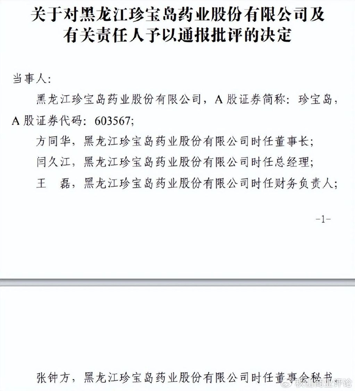 除了业绩下滑,珍宝岛药业还经常出现违规,从而遭到监管机构处分。今年5月16日,上海证券交易所发布纪律处分决定书,对珍宝岛药业及时任董事长方同华、时任总经理闫久江、时任财务负责人王磊、时任董事会秘书张钟方予以通报批评。