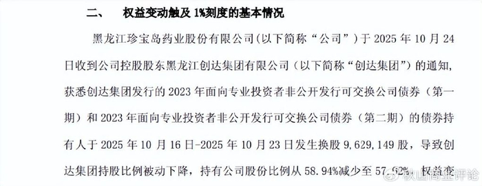 到了10月17日,珍宝岛药业再度发布公告,称10月16日收到创达集团的通知,其持有公司股份比例从59.87%减少至58.94%。10月25日,珍宝岛药业的公告显示,创达集团所持股份比例已经下降至57.92%。也就是说,3个月内,创达集团通过3次减持,所持有的珍宝岛药业股份下降了3.64%,一共是34848150股。