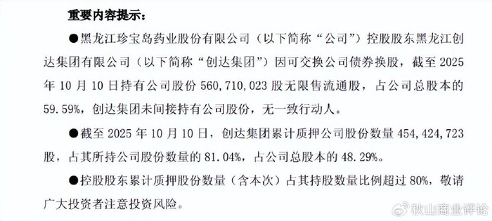 今年10月14日,珍宝岛药业发布公告,称截至10月10日,控股股东创达集团累计质押公司股份数量454424723股,占其所持公司股份数量的81.04%,占公司总股本的48.29%。公告还指出,控股股东累计质押股份数量(含本次)占其持股数量比例超过80%,敬请广大投资者注意投资风险。