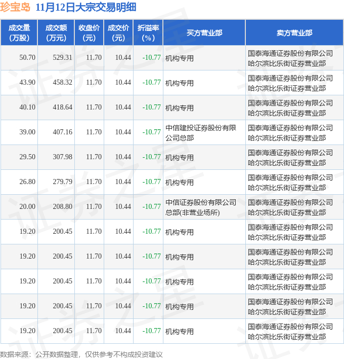 11月12日珍宝岛现12笔折价10.77%的大宗交易 合计成交3612.25万元