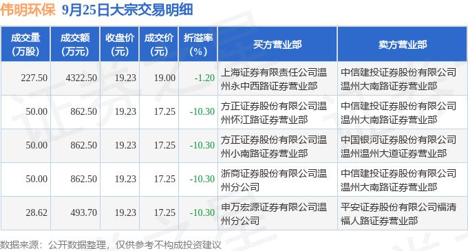 证券之星消息,9月25日伟明环保发生大宗交易,交易数据如下: