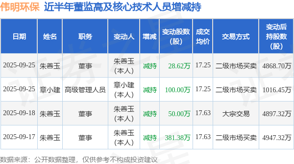 伟明环保近半年内的董监高及核心技术人员增减持详情如下: