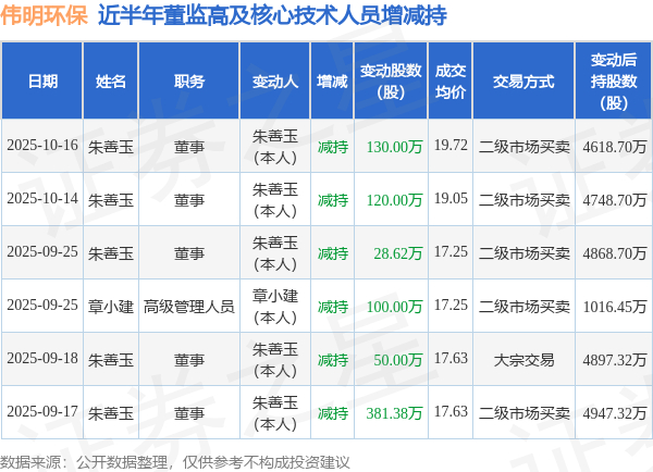 伟明环保:10月16日高管朱善玉减持股份合计130万股