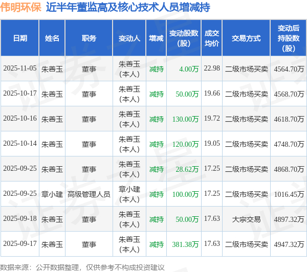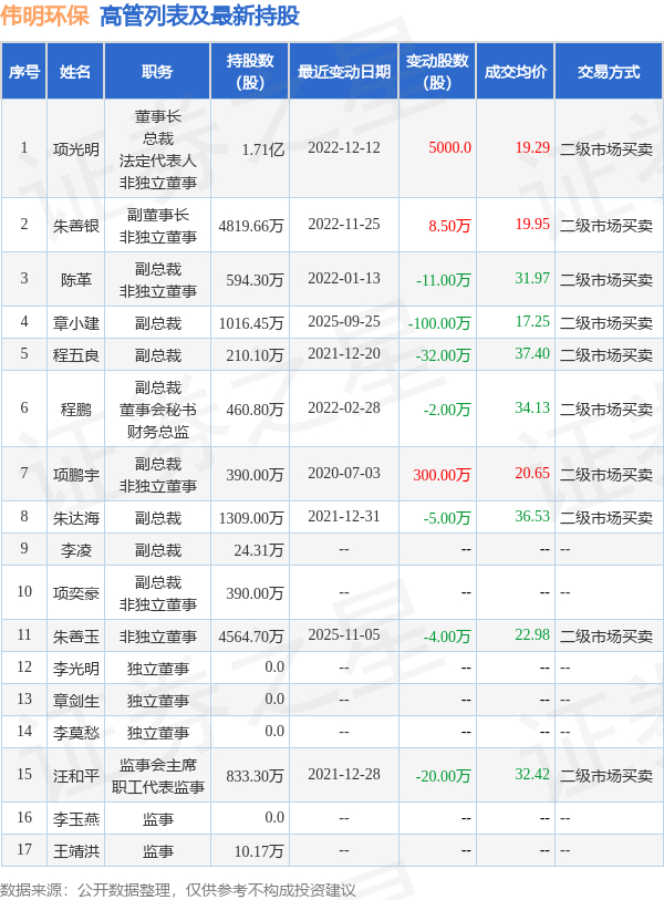 伟明环保近半年内的董监高及核心技术人员增减持详情如下:
