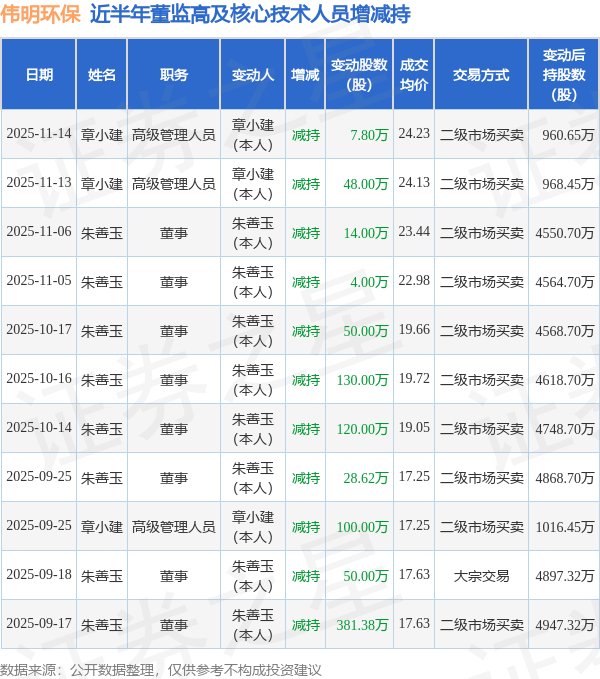 伟明环保近半年内的董监高及核心技术人员增减持详情如下: