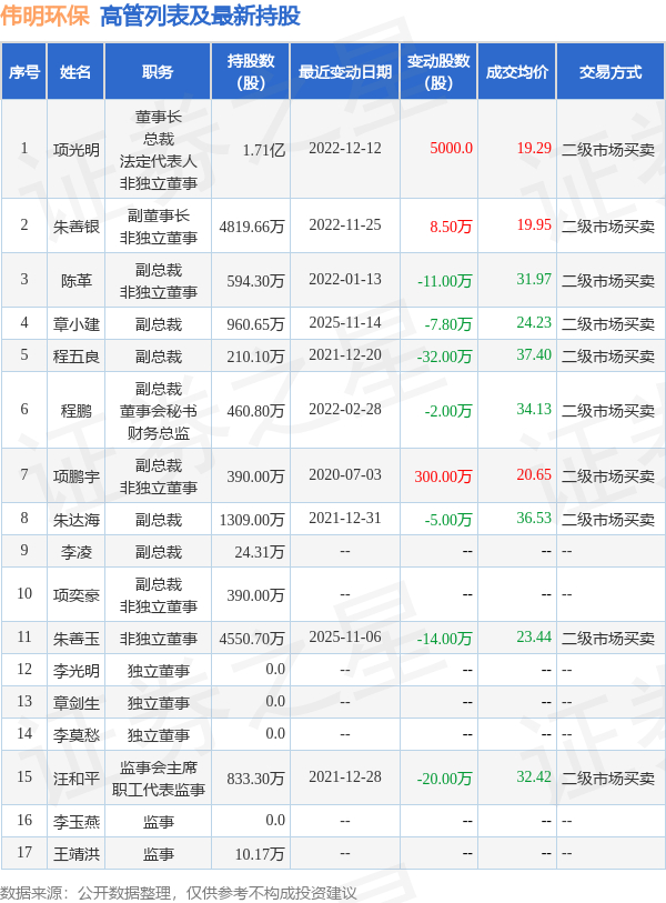伟明环保的高管列表及最新持股情况如下: