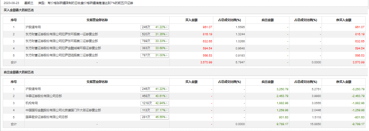 8月23日,长久物流今日跌停,龙虎榜数据显示,上榜营业部席位全天成交1.34亿元,占当日总成交金额比例为21.68%。其中,买入金额为3570.99万元,卖出金额为9789.17万元,合计净卖出6218.18万元。