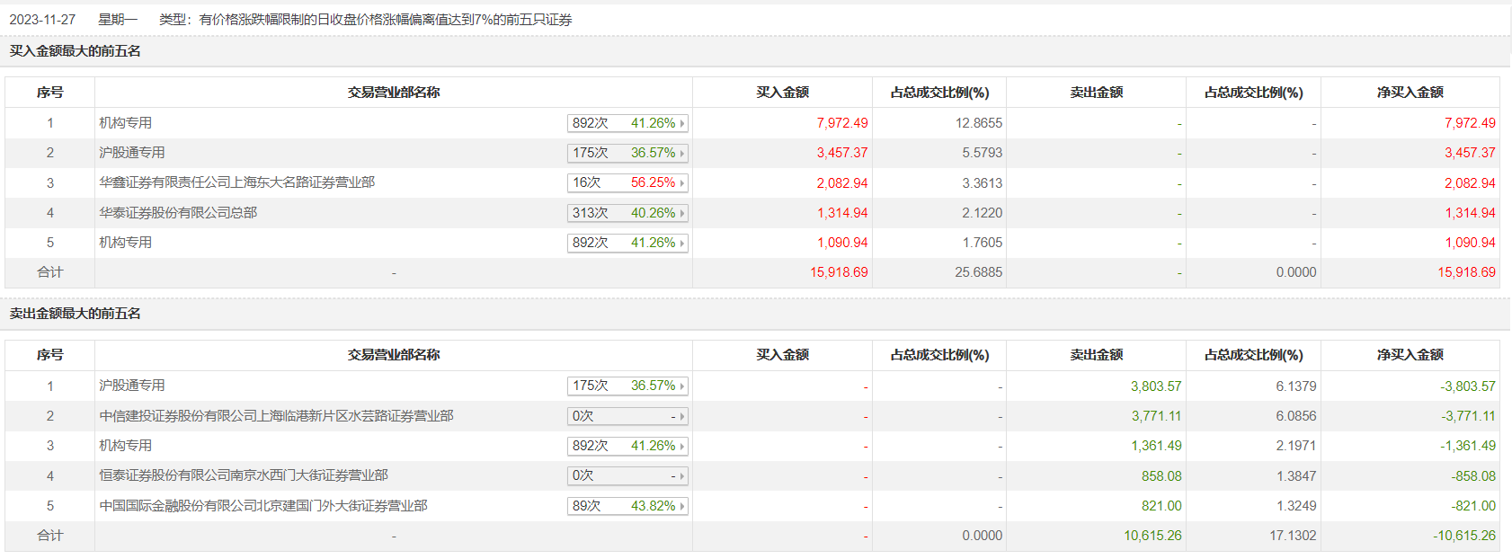 长久物流11月27日涨停,全天换手率达7%,振幅达10.68%。龙虎榜数据显示,营业部席位合计净买入5303.43万元。其中,机构买入9063.44万元,卖出1361.49万元,合计净买入7701.95万元。此外,沪股通专用、华鑫证券上海东大名路证券营业部分别买入3457.37万元、2082.94万元;沪股通专用、中信建投证券上海临港新片区水芸路证券营业部分别卖出3803.57万元、3771.11万元。
