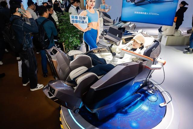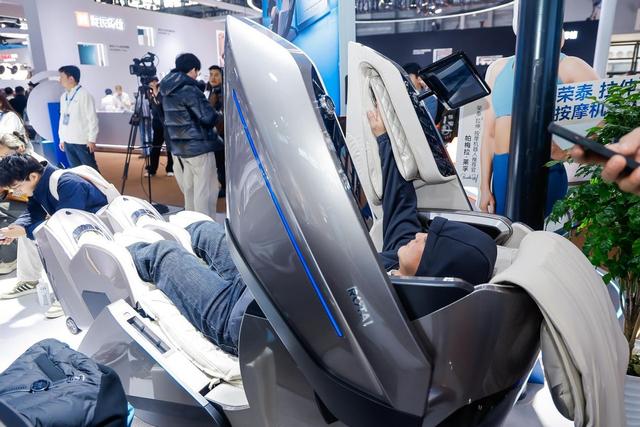 走进荣泰健康的展区,全新发布的RT9000系列按摩机器人占据了展台的“C”位,其独特的双手、双脚独立的造型设计,使其宛如科幻作品中的“机甲驾驶舱”,吸睛无数。环球网记者在现场看到,前来按摩体验的观众络绎不绝,很快就排起了长队。有观众对记者表示,“从来没见过这样的按摩椅,感觉很新奇,想试试和普通造型的按摩椅有什么不一样的地方。”