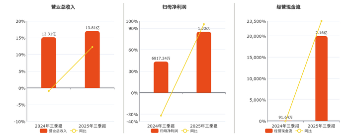 公司营业总收入为13.81亿元,在已披露的同业公司中排名第110。归母净利润为1.33亿元。经营活动现金净流入为2.16亿元。