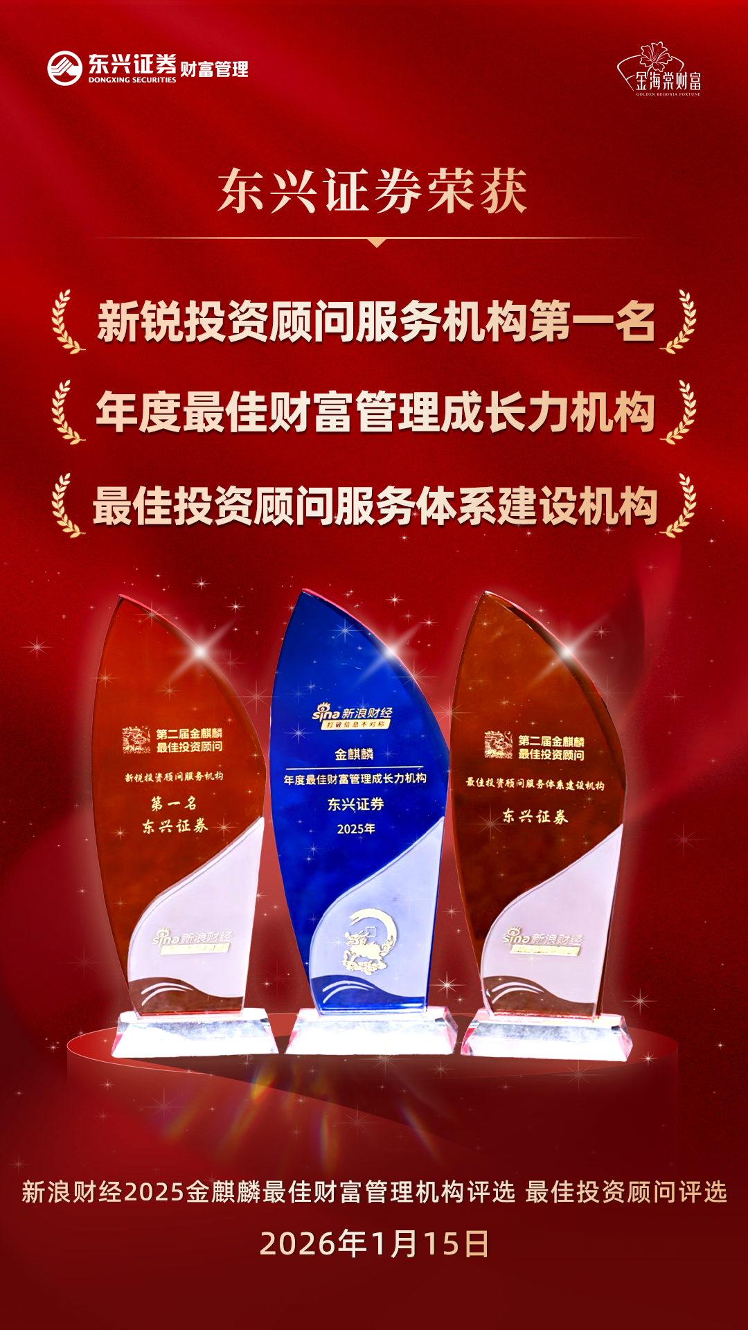 1月15日,由新浪财经主办的2026全球与中国资本市场展望论坛暨金麒麟最佳财富管理机构、最佳投资顾问荣誉盛典在北京举行,东兴证券荣获金麒麟“新锐投资顾问服务机构第一名”、“年度最佳财富管理成长力机构”和“最佳投资顾问服务体系建设机构”三项大奖。同时,东兴证券的16名投资顾问凭借扎实的专业能力与出色表现,斩获27项个人单项奖。