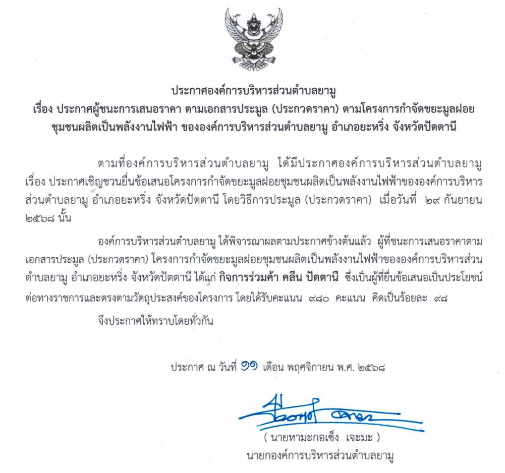 Recently, Pattani Province Clean Joint Venture, a wholly-owned subsidiary of BGE Holdings, officially received the Notice of Award issued by the Yamu Subdistrict Administrative Office of Pattani Province, Thailand. The notice confirms the company as the winning bidder for the "Municipal Solid Waste Incineration and Power Generation Project of Yamu Subdistrict Administrative Office (Yaring District, Pattani Province)", marking that BGE has achieved a successful first victory in its overseas expansion journey in the field of municipal solid waste incineration and power generation.