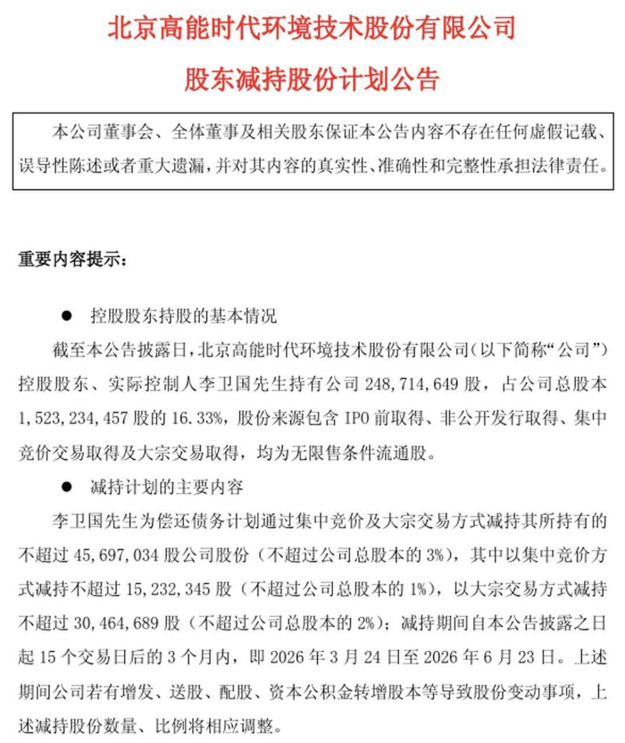 根据公告,李卫国计划于2026年3月24日至6月23日,通过集中竞价及大宗交易方式减持公司股份不超过4569.70万股,占公司总股本比例不超过3%,减持所得资金主要用于偿还自身债务。