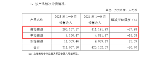 三季度经营数据显示,口子窖核心业务——高档白酒收入前三季度同比减少27.98%,是拖垮整体营收的核心因素。