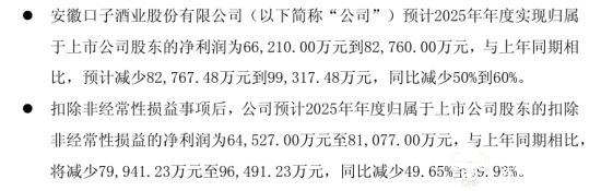 此外,值得一提的是,口子窖发布的2025年年度业绩预减公告显示,公司预计2025年实现归母净利润6.62亿元到8.28亿元,与上年同期相比预计减少8.28亿元到9.93亿元,同比下降50%到60%,或是其上市以来净利润表现较少的一年。