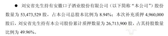 公告显示,口子窖实际控制人、联合创始人刘安省在2023年及2024年质押三笔公司股份并多次展期后,于2026年2月再次补充质押公司股份496万股,累计持有公司股份质押数量为2671.39万股,占其持股数量的49.96%,将近一半。