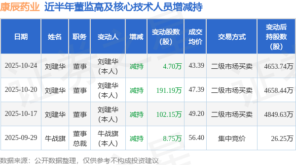康辰药业:10月24日高管刘建华减持股份合计4.7万股