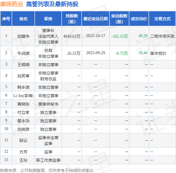 康辰药业近半年内的董监高及核心技术人员增减持详情如下: