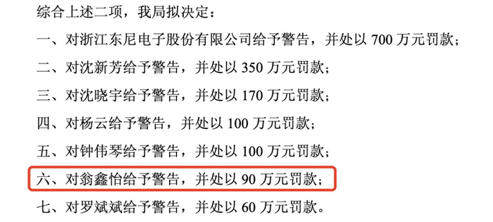 东尼电子95后女董秘翁鑫怡因年报虚假记载拟被罚90万元