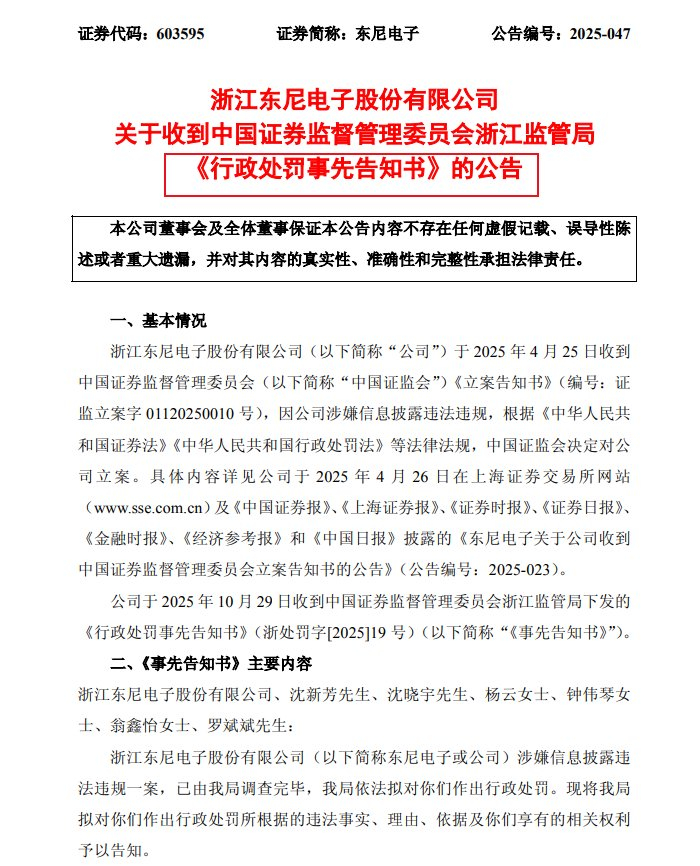 【#东尼电子95后女董秘拟被罚90万元#,去年年薪46万元】近日,上市公司东尼电子发布公告称,公司于2025年10月29日收到中国证券监督管理委员会浙江监管局下发的《行政处罚事先告知书》。根据《告知书》载明的事实,公司存在重大合同进展披露不及时以及年报存在虚假记载两个事项。根据相关规定,公司股票将被实施其他风险警示,A股股票简称将变更为“ST东尼”。公司股票将于10月30日停牌1天,10月31日起实施其他风险警示,股票价格的日涨跌幅限制为5%。根据《告知书》,除公司股票将被“ST”外,东尼电子及6名时任高管拟合计被罚款1570万元。其中一位“95后”董秘拟被罚90万元。