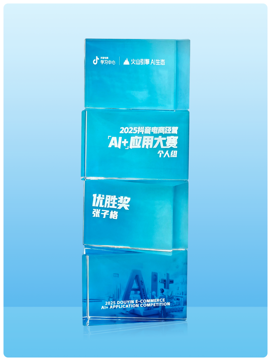 近日,由抖音电商学习中心与火山引擎联合主办的2025抖音电商经营「AI+」应用大赛圆满收官。200多位报名者经过为期1个月时间的激烈比赛,引力传媒电商线效果中心千川总监张子格凭借实战案例分享《AI经营军师实操应用——驱动品牌直播间全域增长新引擎》,在「AI+经营提效」核心赛道表现突出,成功斩获 “个人优胜奖”,并获评 “抖音电商认证讲师”称号,获官方AI+课程开发、授课等核心权益。这一荣誉既彰显其AI电商领域专业实力,更让引力传媒得以将实战验证的AI经营方法论、平台前沿资源与标准化服务能力同步赋能客户,精准破解流量转化、效率提升等经营痛点,助力客户抢占AI电商发展先机。