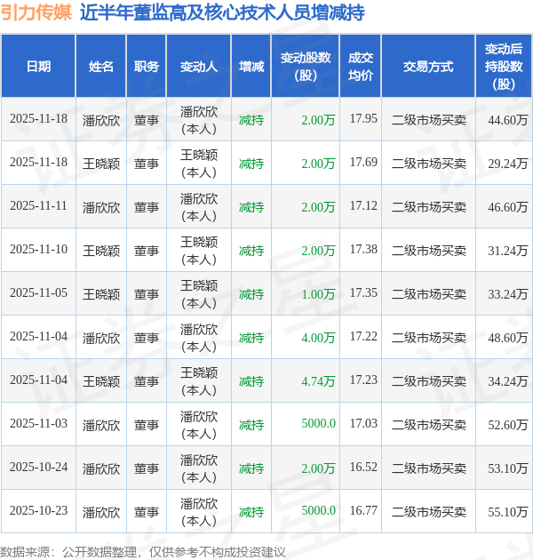 引力传媒:11月18日高管潘欣欣、王晓颖减持股份合计4万股