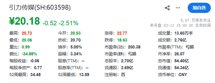 引力传媒于2015年5月27日在A股上市,截至3月12日收市,其总市值约54.4亿元。