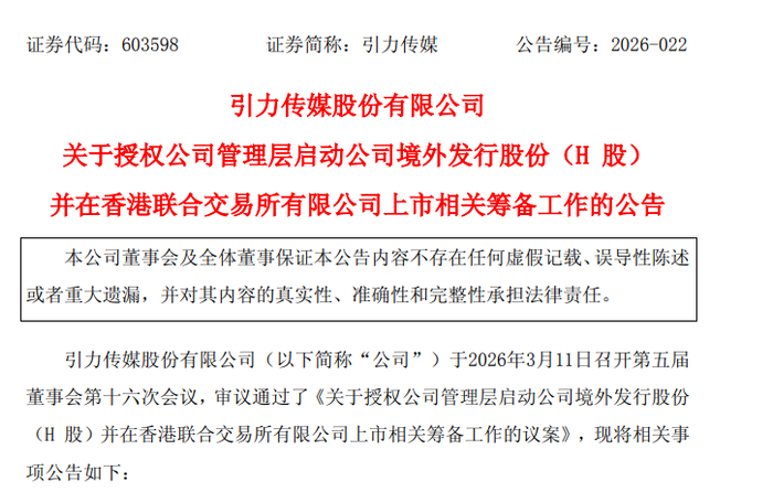 瑞财经 李兰 3月11日,引力传媒(603598.SH)发布公告,根据公司总体发展战略及运营需要,公司拟在境外发行股份(H股)并在香港联交所上市。
