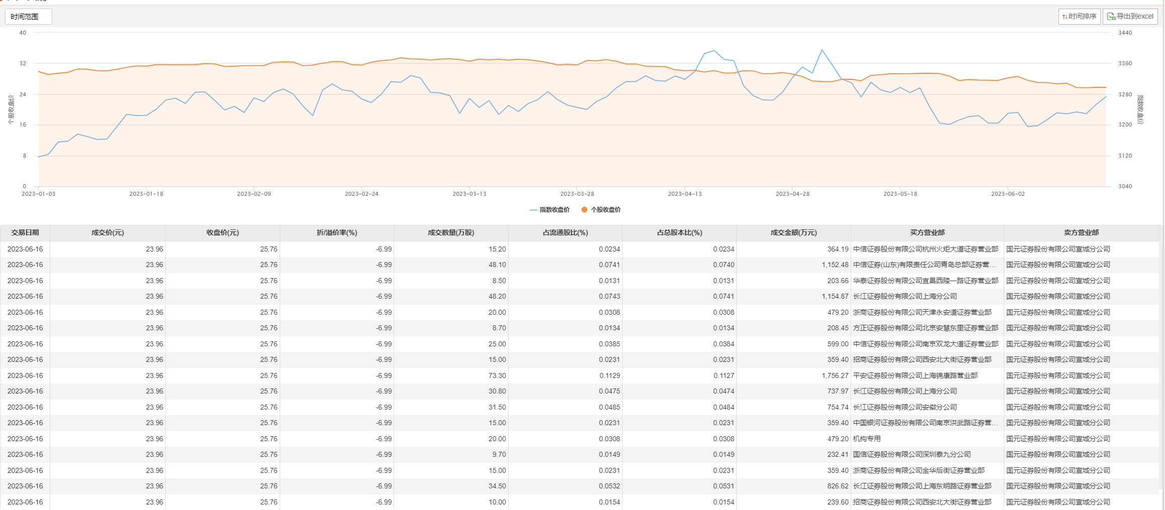 今日大宗交易成交428.5万股,成交额1.03亿元,占当日总成交额的49.96%,成交价23.96元,较市场收盘价折价6.99%。