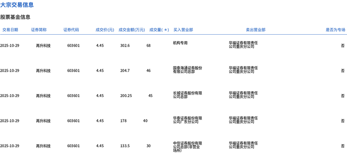 10月29日,再升科技大宗交易成交229万股,成交额1019.05万元,占当日总成交额的8.67%,成交价4.45元,较市场收盘价4.93元折价9.74%。