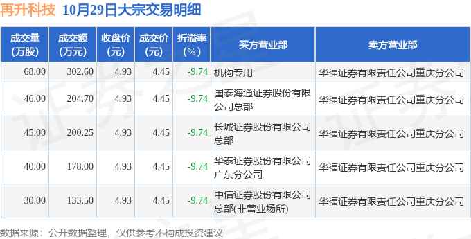 10月29日再升科技现5笔大宗交易 机构净买入302.6万元