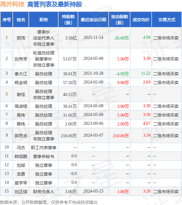 再升科技近半年内的董监高及核心技术人员增减持详情如下: